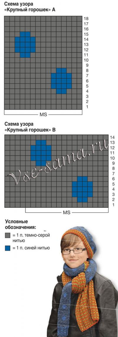 Теракотової ниткою набрати на спиці 62 петлі і плести ребристим візерунком відповідно до зазначеної вище послідовності смуг 1. Через 75 см = 209 р. від початкового ряду зв’язати фісташкової ниткою 2 р. лицьовій гладдю, потім, 75 см = 176 р., дотримуючись наступну послідовність візерунків: 5 п. платочної в’язкої темно-сірою ниткою, 52 п. візерунком «Великий горошок» А і 5 п. платочної в’язкої темно-сірою ниткою. За-
