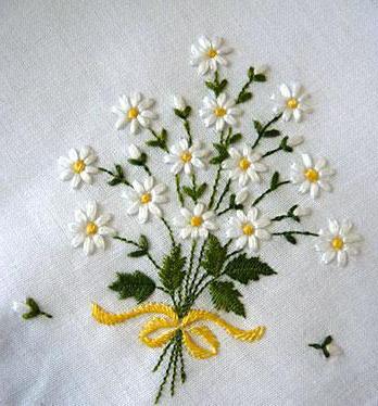 Стеблинки у ромашок виконуються як і попередньому випадку. Вишивка стрічками ромашки закінчена.