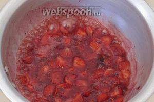 Для початку зробимо заготовку з полуниці. Полуницю наріжемо дрібно і поставимо на вогонь, разом з невеликою кількістю цукру. Не забуваємо постійно помішувати. Доводимо до кипіння і знімаємо з вогню.
