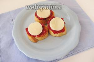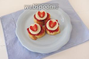 Викладаємо на грінки заварную полуницю і кружечки крему.