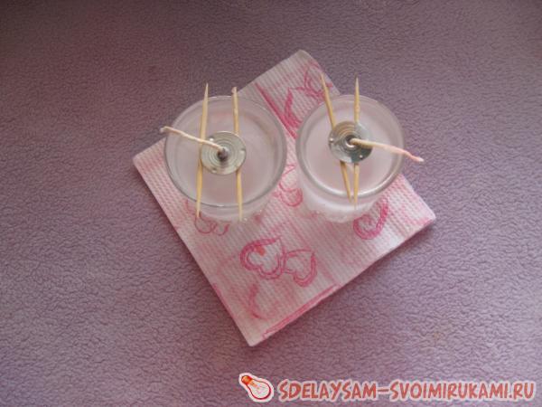 По центру кожного стаканчика кладемо по дві зубочистки. Тепер вставляємо гніт в утримувач і акуратно тепер всі разом ставимо по центру зубочисток. Стежимо, щоб нитка опускалася рівно по центру.