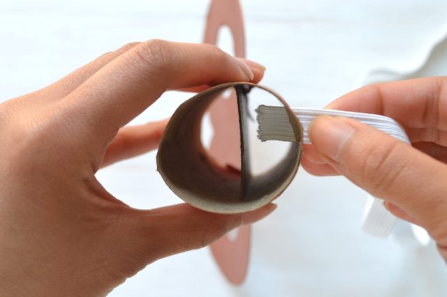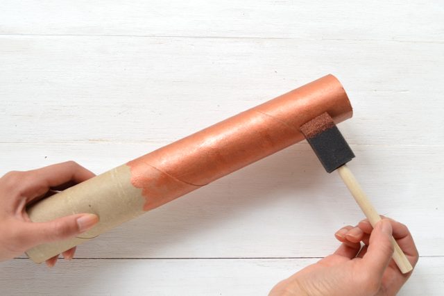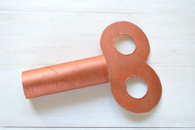 Офарблюємо ключ і рулон фарбою відповідного кольору – під чорнене золото, мідь або звичайний метал. Вклеюємо плоску частину ключа в об’ємну картонну трубу, обрізаємо по необхідності трубу до потрібної довжини.