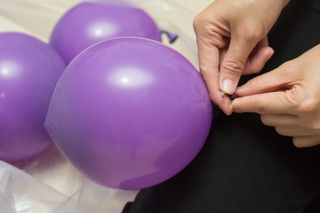 Купуємо близько 50-ти надувних кульок відтінку від фіолетового до малинового, бордового або який ще буває у темного винограду, а також в’язану шапочку в колір кульок. Надувати кульки, зав’язуємо кожен, одягаємося в трико і просимо в допомогу ще пару рук.