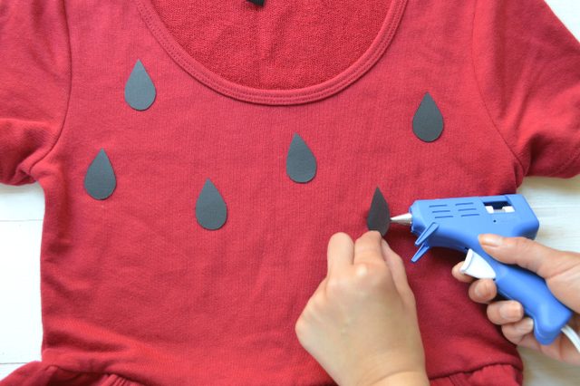Нарізаємо з картону або виробної фетру чорного або білого/жовтуватого кольору крапельок, що нагадують насіння. Клеїмо їх гарячим клеєм на всі плаття, розподіляючи більш-менш рівномірно.