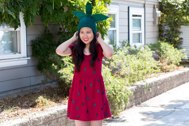 Ці листя наклеюємо гарячим клеєм на зелену в’язану шапочку ззаду, а потім підгинаємо листя, щоб вони дивилися віялом трохи під кутом назад і в сторони – як верхівка полуниці. Готово!