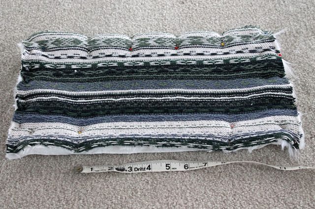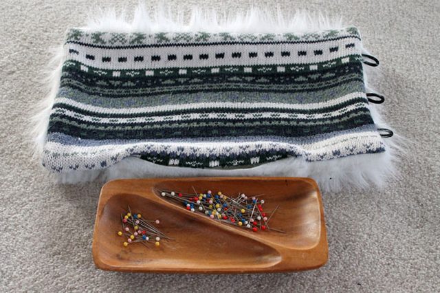 3. Попарно накладаємо шматки светри на шматки хутра лицьова до лицьової, ретельно вирівнюючи всі краї. Заколюємо по периметру шпильками. В нижній частині кожної парної деталі залишаємо близько 20 см відкритими для вивертання готових виробів на лицьову сторону.