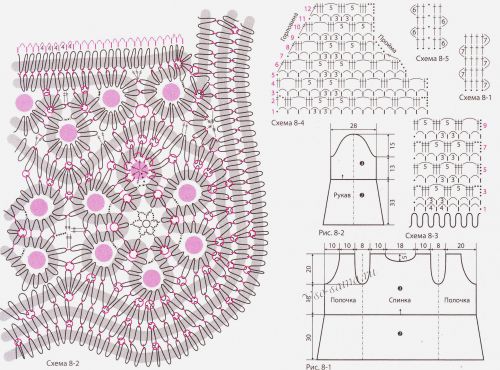 В’яжете основним візерунком за схемою 8-3. Пройми формуєте, збавляючи з двох сторін петлі за схемою 8-4 (з 5-го по 9-й ряди). На схемі вказано як збавляти петлі з одного боку, а з іншого убавляете в дзеркальному відображенні. Всього на кожній проймі зменшується на 2,5 раппорта (осередку) візерунка. Далі в’яжете рівне. Через 15 см від початку пройм робите горловину і вывязываете кожне плече окремо. Для горловини убавляете в одному ряду посередині полотна 25 п. Через 20 см від початку пройм закінчите роботу над плечем (6 раппортов візерунка + 3 п.). Друге плече вывязываете аналогічно.