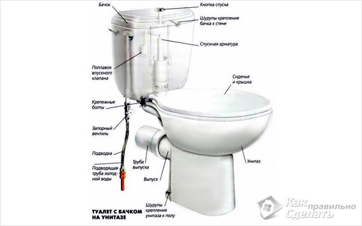 - механізм наповнення водою і по регулюванню наповнення: заливний клапан, впускна арматура, поплавок і кульовий кран,