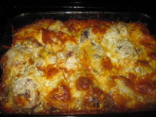 • Випікати слід в заздалегідь розігрітій духовці приблизно 25 хвилин. Курочка має досить просмажиться, а сир – стати золотисто-грайливого кольору. Блюдо готове, приємного апетиту!