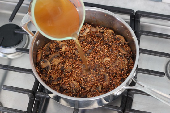 • Залийте гречку підготовленої грибний рідиною і доведіть до кипіння. Після закипання потрібно зменшити вогонь і проварити під кришкою 8-10 хвилин, поки більша частина рідини не вбереться.