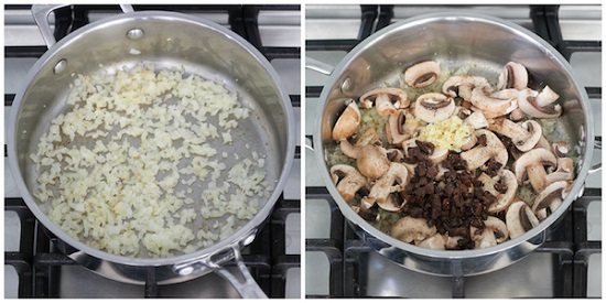 • У просмажений цибулю потрібно викласти сухі і свіжі гриби, а також дрібно порізаний часник. Приправте сіллю і меленим чорним перцем.