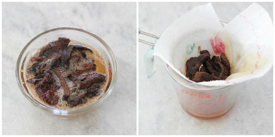 • Сушені білі гриби потрібно залити окропом і дати настоятися 10 хвилин до розм’якшення. М’які гриби процідіть через сито і просушіть паперовим рушником.