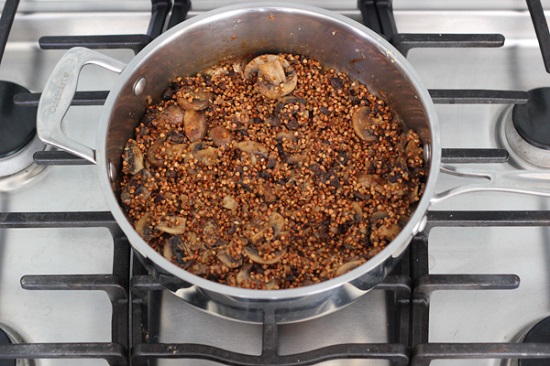 • Додайте гречку і обсмажте разом з грибами близько 2 хвилин.