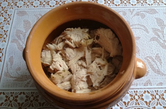 • Зварену курку слід порізати на порційні шматочки і викласти в горщик.