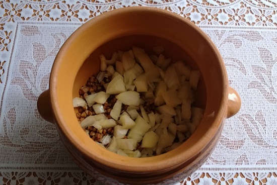 • Гречану крупу треба перебрати і добре промити, викласти в горщик і посолити.