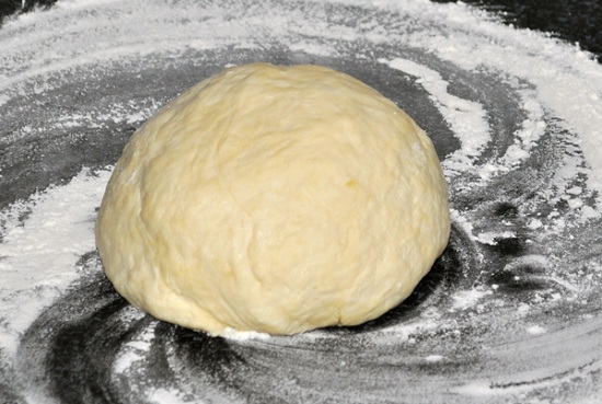 • Коли працювати ложкою стане важко, викладаємо тісто на стіл, присипаний борошном, і продовжуємо вимішувати руками. Кількість борошна може змінюватись в залежності від її властивостей.