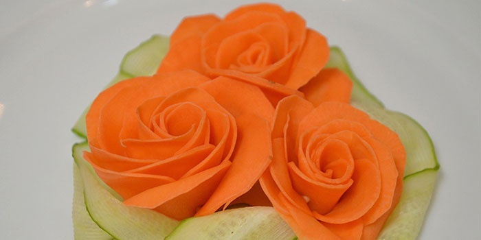 - Листя такої овочевої троянди з моркви дозволено зробити з використанням цибулі, кропу, петрушки або іншої зелені.