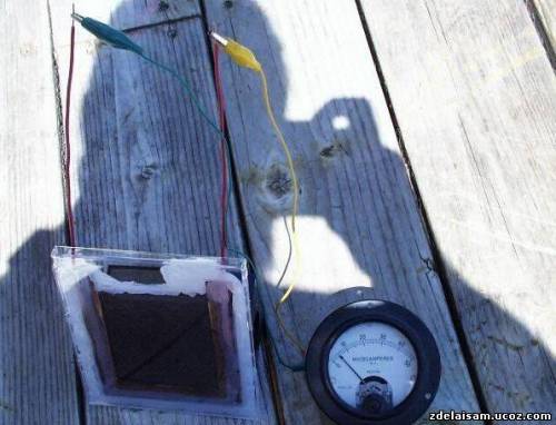 На фотографії вище готова сонячна батарея В ТІНІ,амперметр показує приблизно 6 міліампер.Але навіть у темряві ця батарея буде давати кілька міліампер))