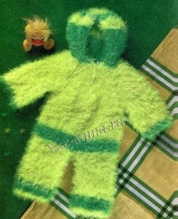 На висоті реглана 12 см петлі рукавів відкладіть і в’яжіть спинку і полички єдиним полотном 10 см, потім поміняйте на зелену нитку і в’яжіть ще 4 див. Далі в’язання розділіть на 2 частини і в’яжіть кожну штанину окремо 12 см жовтою ниткою, 3 см зеленої і 1 см жовтою ниткою. Закрийте петлі. Поверніться до петель рукави і в’яжіть 13 см жовтою ниткою і 1 см зеленої. Закрийте петлі. Для капюшона по краю горловини наберіть 80 п. зеленою ниткою і в’яжіть осіб. гладдю 11 см, потім провяжите 2 см жовтою ниткою, 2 см зеленої і знову 2 см жовтою ниткою. Петлі закрийте.
