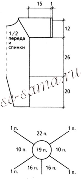 Виріб в’яжеться зверху вниз єдиним полотном. Наберіть яскраво-жовтою ниткою 66 п., в’яжіть осіб. гладдю. Через 4 ряди розділіть роботу наступним чином: 10 п. полички, 1 п. реглана, 10 п. рукави, 1 п. реглана, 22 п. спинки, 1 п. реглана. 10 п. рукави, 1 п. реглана, 10 п. полички. Продовжуйте в’язати осіб. гладдю, додаючи з обох сторін від кожної лінії реглана по 1 п. в кожному 2-му ряду.