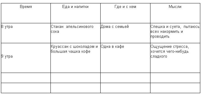 3. Ще один важливий момент – чому ви приймаєте їжу. Можете доїдати за дитиною, перекусити в компанії, пообідати, тамуючи голод, поїсти від нудьги і т. п. Всі причини необхідно занести в щоденник. Надалі аналіз цих причин допоможе виключити зайві прийоми їжі.