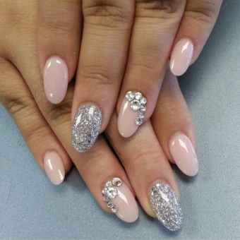 Для того, щоб додати родзинку простому манікюру, наприклад, бежевому, його комбінують зі стразами. Для цього нігтьову пластину доповнюють камінчиками в довільному порядку. Такий варіант відмінно підходить для виконання в домашніх умовах. Можна з допомогою каменів викласти візерунок, наприклад, завиток або квітка. Особливо це добре виглядає, якщо використовувати камінчики різних кольорів.