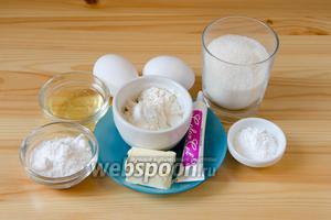 Тепер можна зайнятися бісквітом. Для його приготування нам знадобиться борошно, яйця, цукор, розпушувач, а також яєчний білок, цукрова пудра, вершкове масло і харчовий барвник.