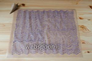 Тепер необхідно нанести малюнок на пергамент. Для цього кольорову пасту необхідно вкласти в корнетик з пергаменту, зрізати у нього кінчик, діаметром 1-2 мм, і нанести бажаний малюнок на пергамент. Якщо Ви хочете використовувати якийсь складний малюнок, то його краще заздалегідь намалювати олівцем на пергаменті, а потім наносити малюнок пастою, попередньо перевернувши пергамент. Можна також використовувати трафарет з малюнком, підклавши його під пергамент. Тут все залежить від вашої фантазії. Щоб малюнок при покритті його тестом не стерся, пергамент необхідно прибрати на 20 хвилин в морозильну камеру. Залишки кольоровий пасти можна прибрати в морозильник і використовувати в міру необхідності.