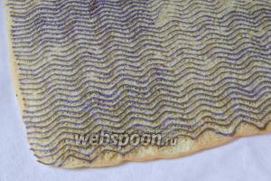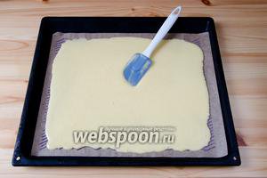 Дістаємо пергамент з малюнком і виливаємо поверх нього тісто. Акуратно розрівнюємо тісто по всій поверхні, намагаючись не пошкодити малюнок. Відправляємо тісто в духовку, розігріту до 180°С на 7-8 хвилин. Щоб рулет було легко згортати, важливо не пересушити бісквіт.