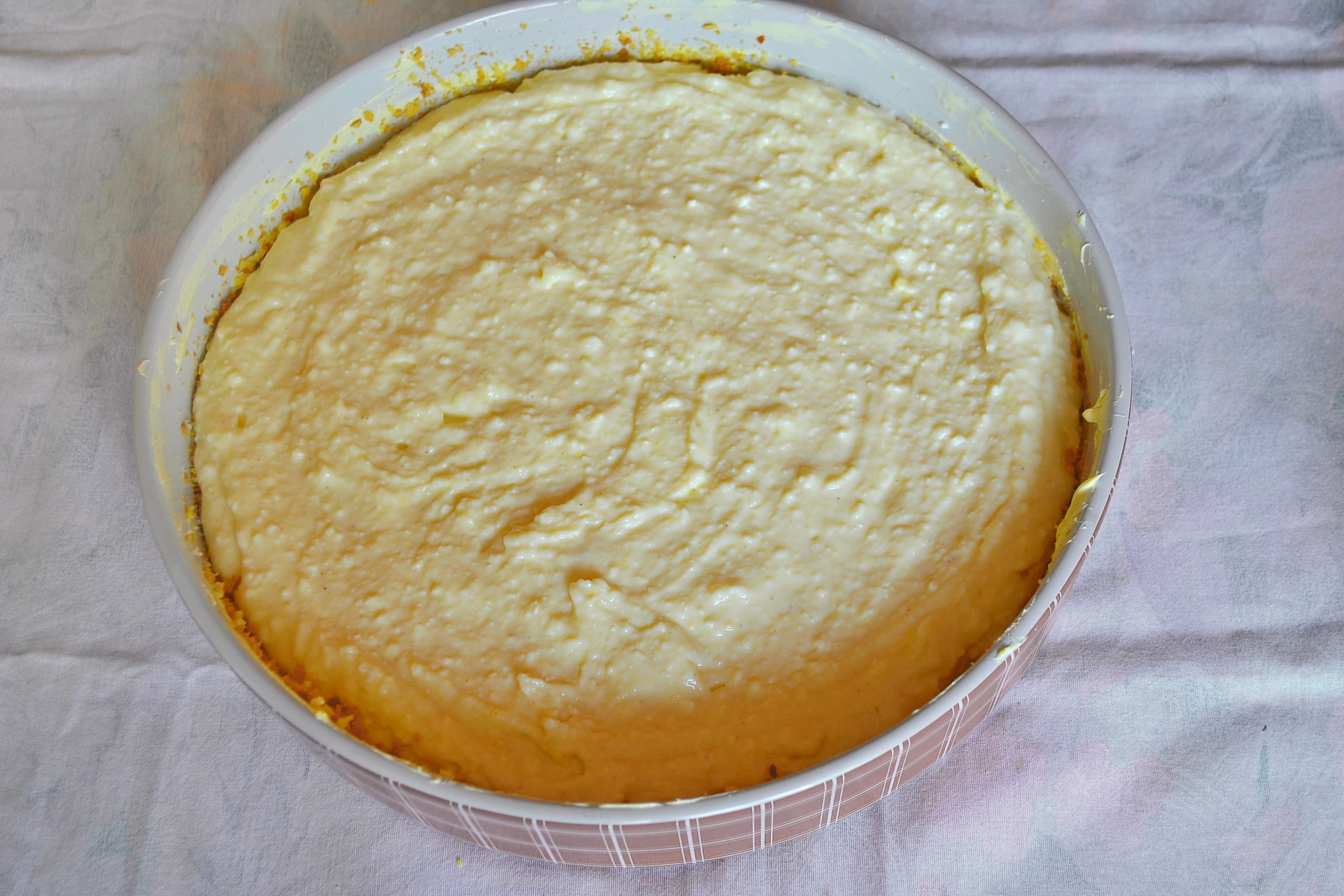 Включити духовку на 180°С. Змастити круглу форму для випічки маслом і посипати панірувальними сухарями. У сирну суміш акуратно ввести білки, акуратно перемішати і вилити тісто у форму.
