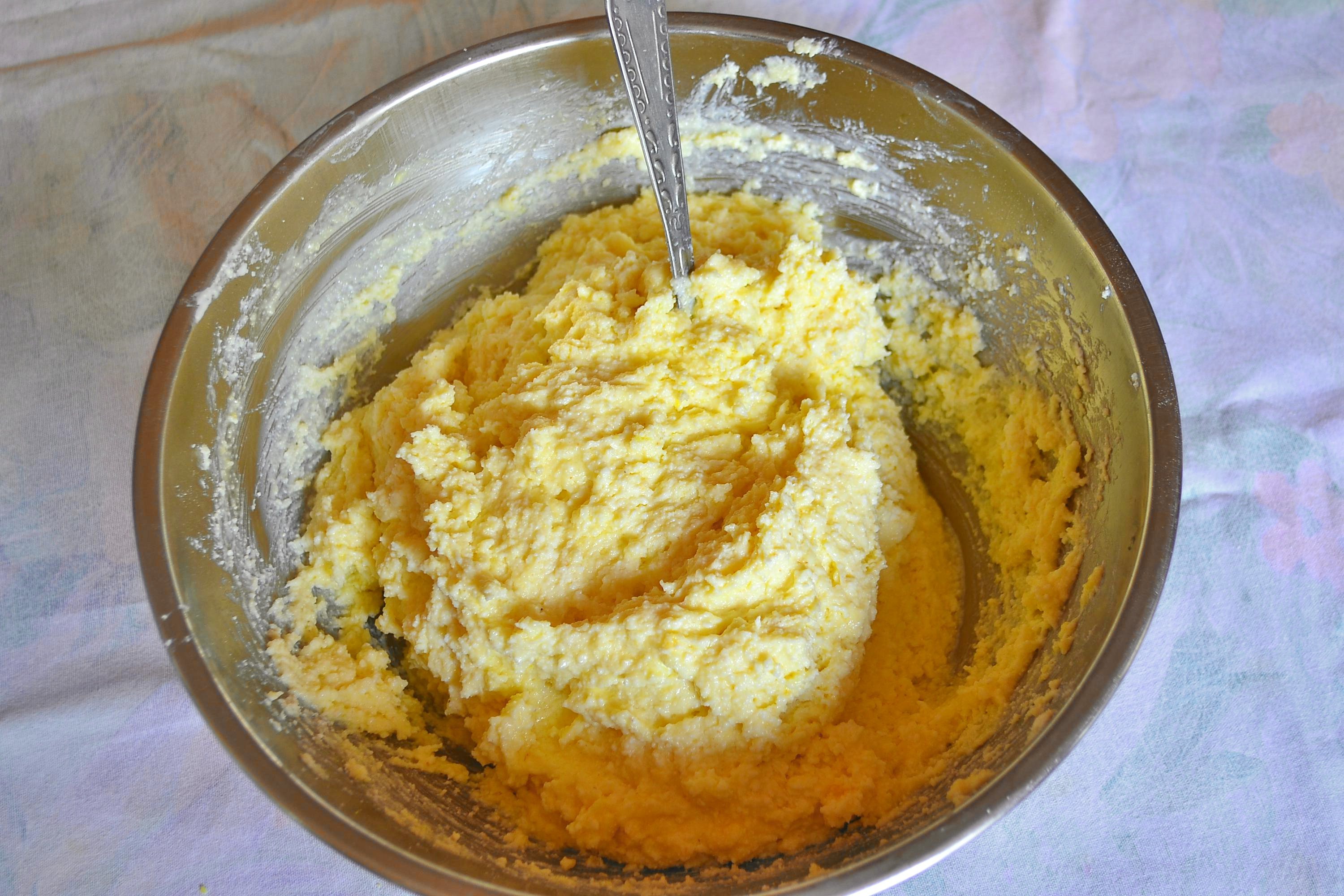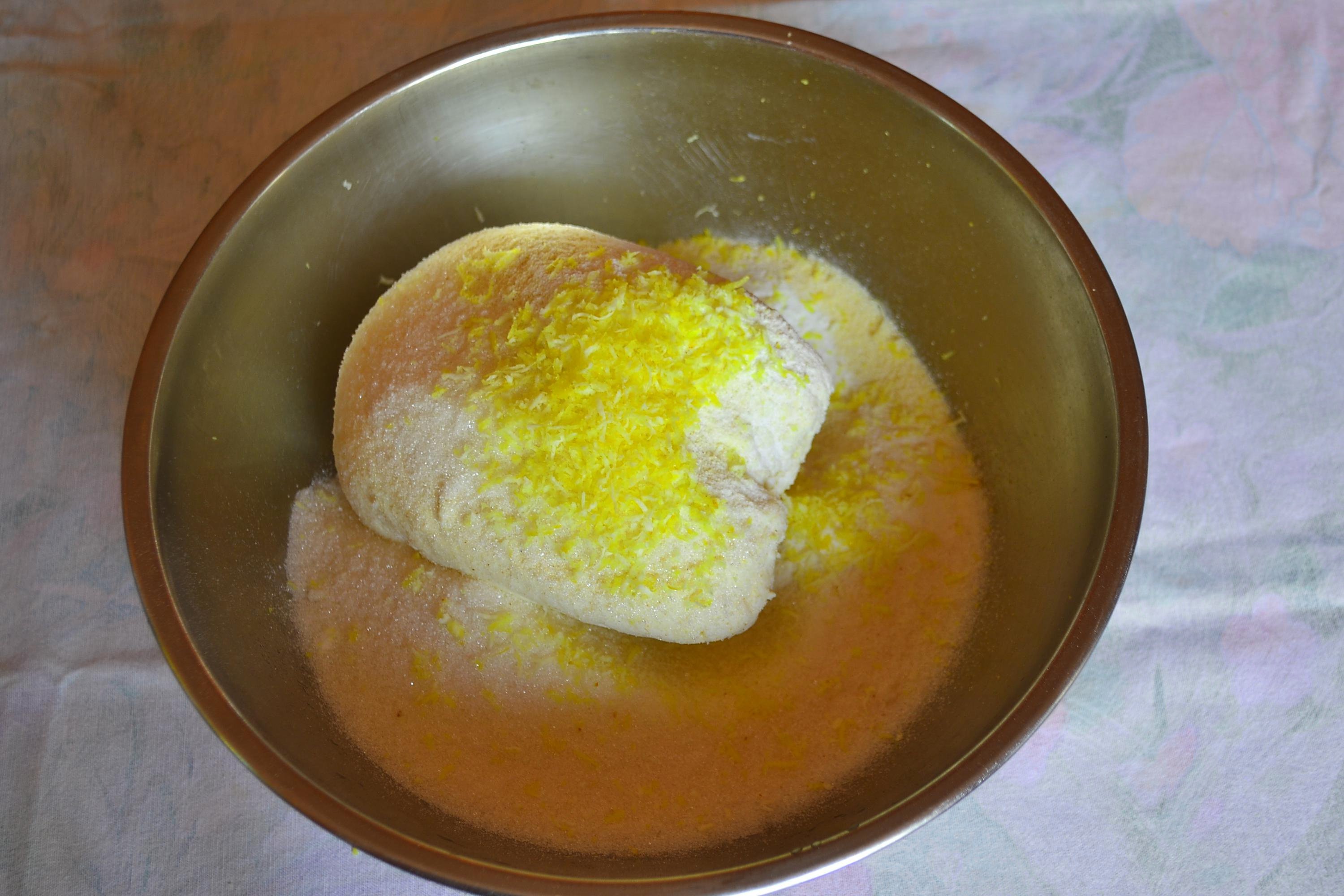 У миску відправити сир, жовток яєць, цукор, ванільний цукор, манку, порошок для випічки і натерти цедру з 1 лимона.