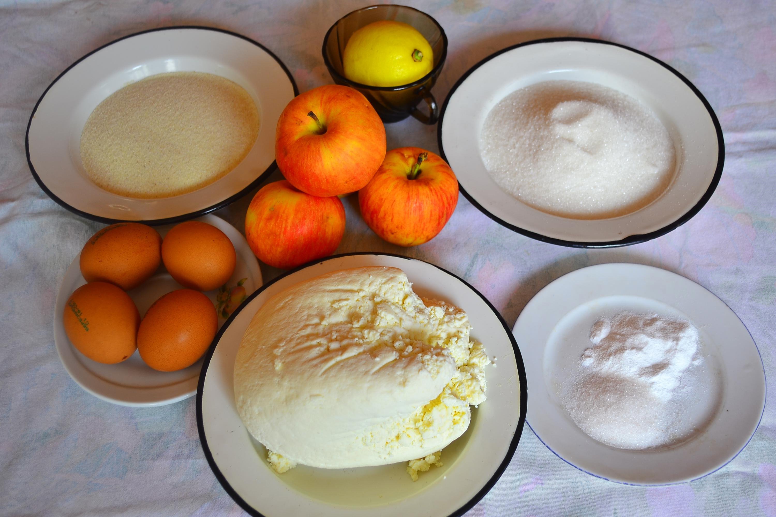Підготуємо всі необхідні інгредієнти: сир, яблука, яйця, манну крупу, лимон, цукор ванільний, порошок для випічки і сіль.