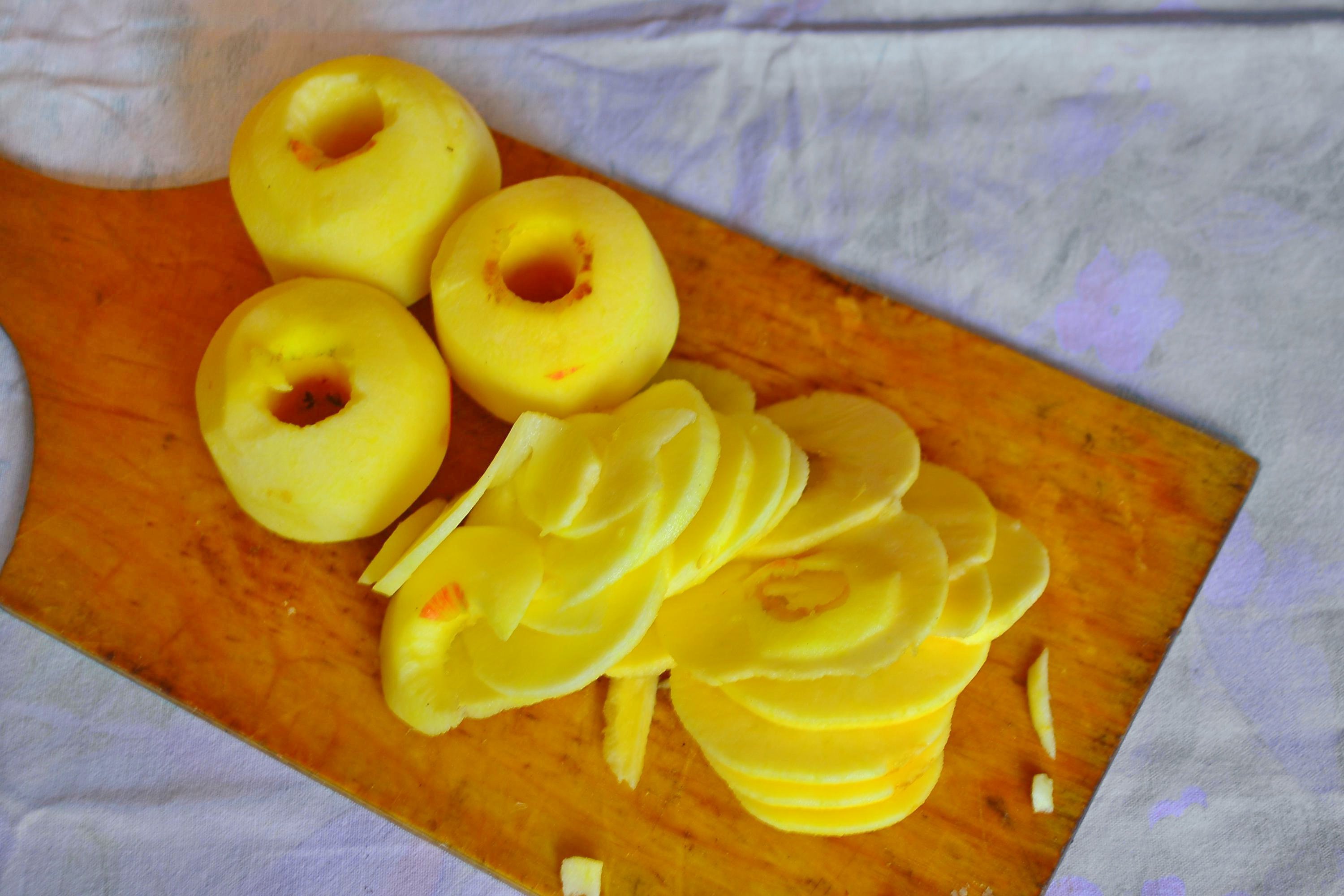Яблука вимити, зняти шкірку і вирізати серединку. Нарізати тоненькими кільцями.