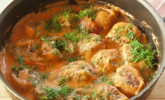 - У соус викладіть тефтелі, закрийте кришкою і тушкуйте протягом 15 хв. Подавайте з рубаною зеленню. Що стосується самих тюфтельок, то їх можна готувати з різних видів м’яса та круп.