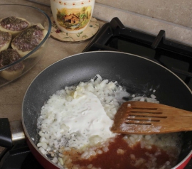 Очищену цибулину наріжте невеликими кубиками і обсмажте у великій глибокій сковороді. Туди ж покладіть подрібнену моркву і обсмажуйте до рум’яності. Після цього відправте в сковороду томатну пасту;- Додайте сіль і перчик, а потім, рівномірно присипте все борошном і гарненько перемішайте. Трохи обсмажте, а тільки потім налийте воду до 1/3 сковороди. Доведіть до кипіння і залиште гаситися на мінімальному вогні;
