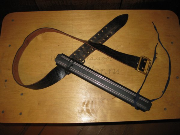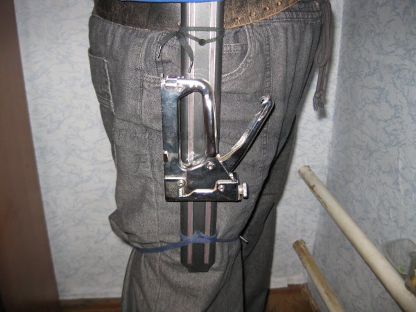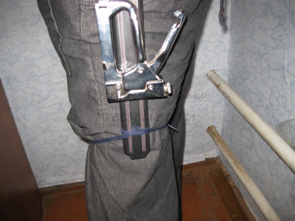Наприклад, кріплення верхнього кінця держателя до ременя, можна зробити більш простим і надійним, якщо використовувати невелике болт з гайкою. А для кріплення нижнього кінця держателя до стегна, замість шнурка можна використовувати ремінець з липучкою.