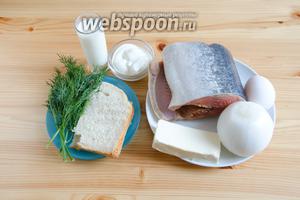 Для приготування нам знадобиться кета, плавлений сирок, цибулю, яйце, сметана, кріп, молоко, хліб, а також сіль і перець.