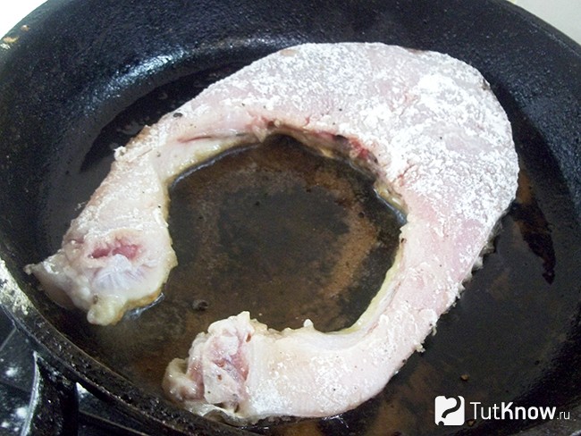 5. Сковороду поставте на плиту, налийте олію і дуже добре його нагрійте. Коли сковорода буде диміти, це означає, що вона вже напружена і можна приступати до жаренью риби. Кладіть стейки на сковороду і смажте їх на великій спеці.