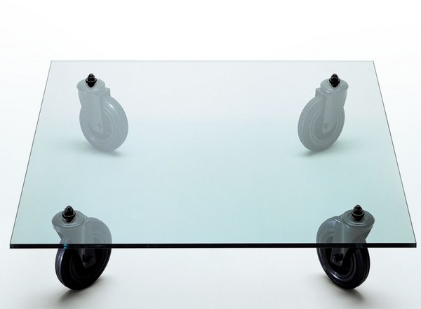 Оскільки конструкція такого столика, по суті, являє собою лише стільницю, краще віддавати перевагу високим і масивним колесам. Наприклад, на фото нижче в скляному столику використовуються колеса від дитячої коляски і напрямні від декоративної вози.