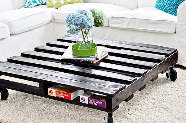Будівельні піддони є відмінним матеріалами для створення незвичайних журнальних столиків. Можна використовувати один піддон або ж скласти кілька виробів таким чином, щоб вони представляли єдиний елемент. Оскільки такий столик не передбачає наявність ніжок, колеса монтуються до основи нижньої піддону. На додаток столик з піддонів можна покрити лаком або фарбою.