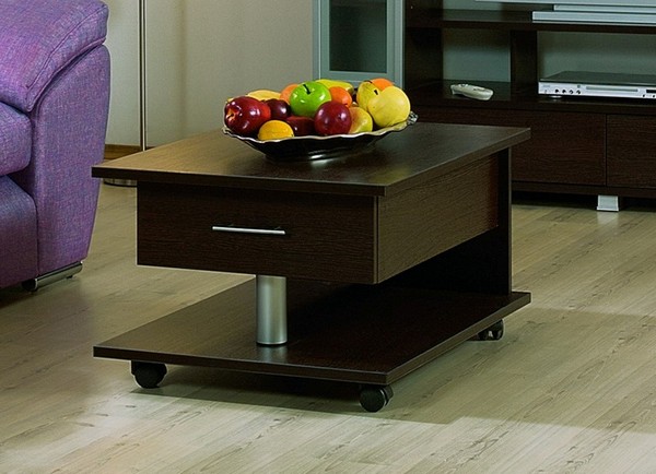 Найбільшою відрізняється практичністю журнальний столик на колесах, який вільно переміщується не тільки в межах одного приміщення, але і по всій квартирі. Такий столик на колесах можна використовувати і в якості сервіровки столу, і як підставку під ноутбук, і просто як оригінальний предмет інтер’єру.