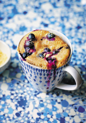 Інгредієнти: 2 ст. л. м’якого вершкового масла, 1 середнє яйце, 1 ст. л. нежирного молока 1,5–2,5%, 1 ч. л. екстракту ванілі, 3 ст. л. світло-коричневого цукру, 4 ст. л. борошна з розпушувачем, щіпка солі, ? ч. л. меленої кориці, 3 ст. л. свіжої чорниці, ? ч. л. темно-коричневого тростинного цукру