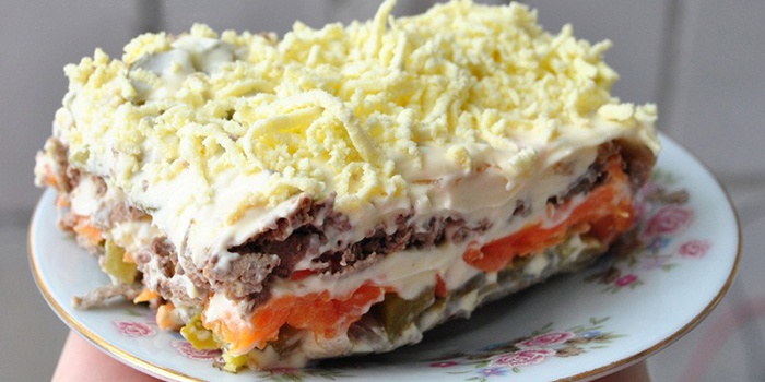 Для чоловіка немає нічого краще, ніж рецепт салату на день народження з м’ясом. Пропоноване блюдо об’єднує в собі яловичину, овочі і пікантний тайський соус, а тому виходить дуже ситним, з нотками гостроти і кислинки. Необхідні компоненти: