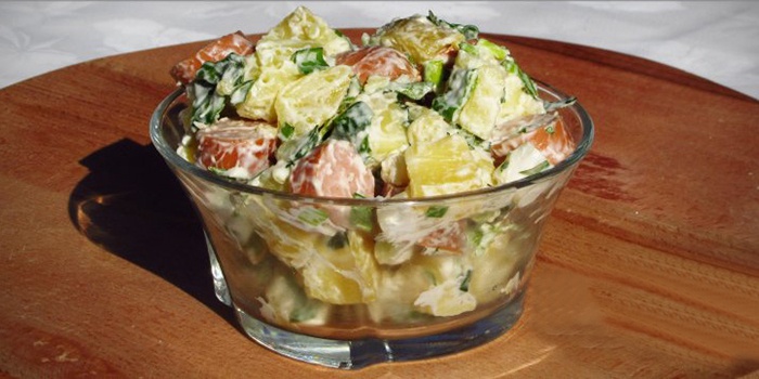 Якщо ви хочете приготувати за рецептом дешевий салат на день народження, то цей варіант вас зацікавить. Ковбаски, печена картопля поєднуються зі свіжістю зелені і солодкістю помідорів черрі. Перелік компонентів: