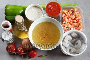 Бульйон овочевий 500 млКреветки заморожені очищені – 150 гЦибуля зелена 1 пероЦибуля ріпчаста 1 шт.Олія оливкова Extra Virgin 1 ст. л.Перець паприка 1 шт.Перець чилі свіжий – 1 шт.Помідори 100 гПомідори консервовані 150 млРаки 100 гРис довгозернистий 170 гСелера стебла 1 шт.Суміш перців 1 щіпкаСіль 1 ч. л.Часник 1 зубчик
