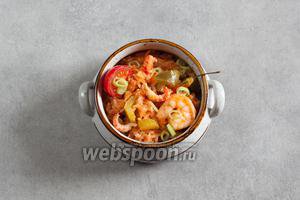 Коли джамбалайя, в принципі, готова, додаємо варених раків і помідори, солимо і перчимо сумішшю перців за смаком.
