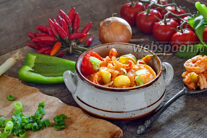 Додаємо рис, креветки, томатну рідина, бульйон і чилі, перемішуємо все це справа і варимо на середньо-слабкому вогні, поки джамбалайя не досягне потрібної вам консистенції. Перемішування в процесі приготування, не забороняється. Якщо відчуваєте, що занадто сухо — підливайте по ходу ще води або бульйону, якщо він є в запасі.