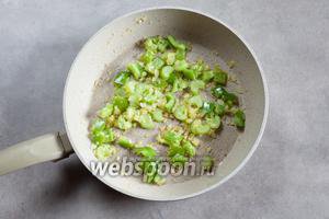 Селера, зелений перець, цибулю обсмажуємо в 1 ложечці рослинного масла до того, як цибуля почне золотитися, закидаємо до них часник і смажимо ще 2-3 хвилини.