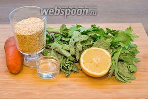 Кіноа 100 гОлія оливкова Extra Virgin 3 ст. л.Морква 150 гМята свіжа 30 гПетрушка свіжа 50 гСелера листя свіже 30 гСік лимонний 1 ст. л.