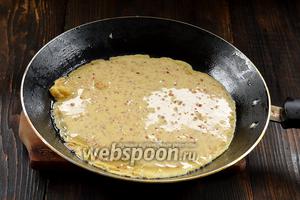 На гарячу млинцеву сковороду тонким шаром налити тісто і розподілити його по сковороді, нахиляючи сковороду в різні сторони.